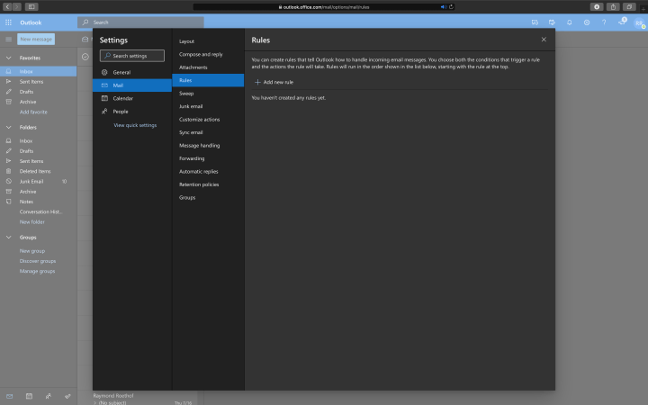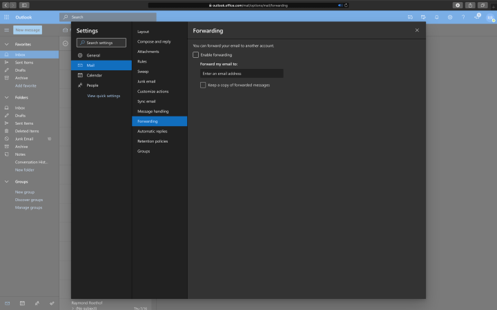 To get the forwarding rules and inbox rules, go to Settings in the top right corner within Office 365, click on View all Outlook settings, go to Mail, followed by Forwarding and Rules.