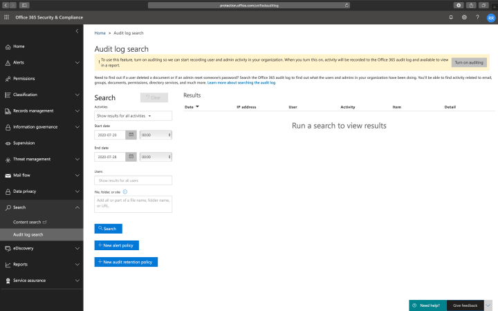 Note: Audit log search is not turned on by default. Microsoft is changing the default option, so it is enabled by default soon. If the option is disabled, you will see a message saying Turn on auditing.