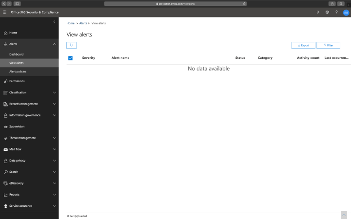 The last view I can recommend is the Alert View. The alert view gives a good overview of any risk level alerts available within the tenant.