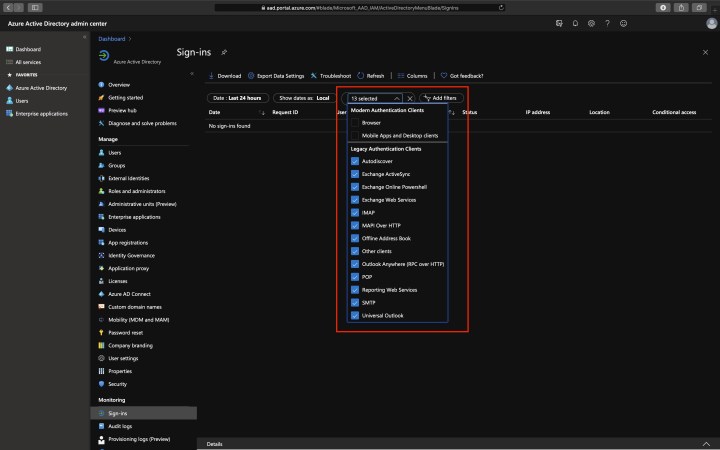 - Add filters > Client App > select all of the legacy authentication protocols. Select outside the filtering dialog box to apply your selections and close the dialog box.