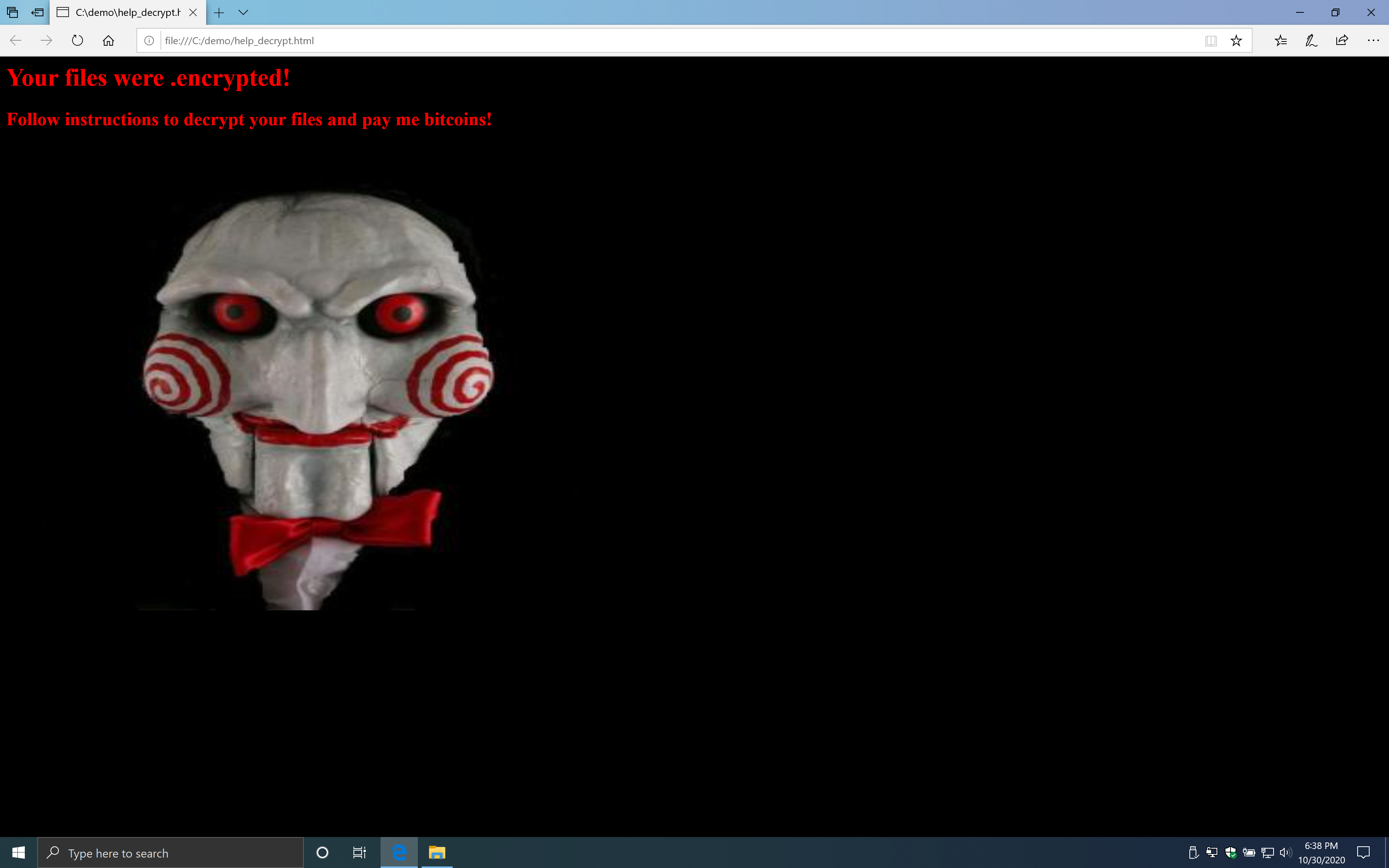 If you run the executable from a USB drive, it will encrypt files in the c:\demo folder and show a popup with a message that your files are encrypted.