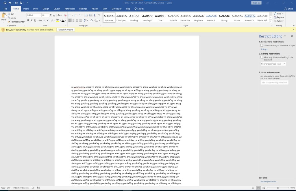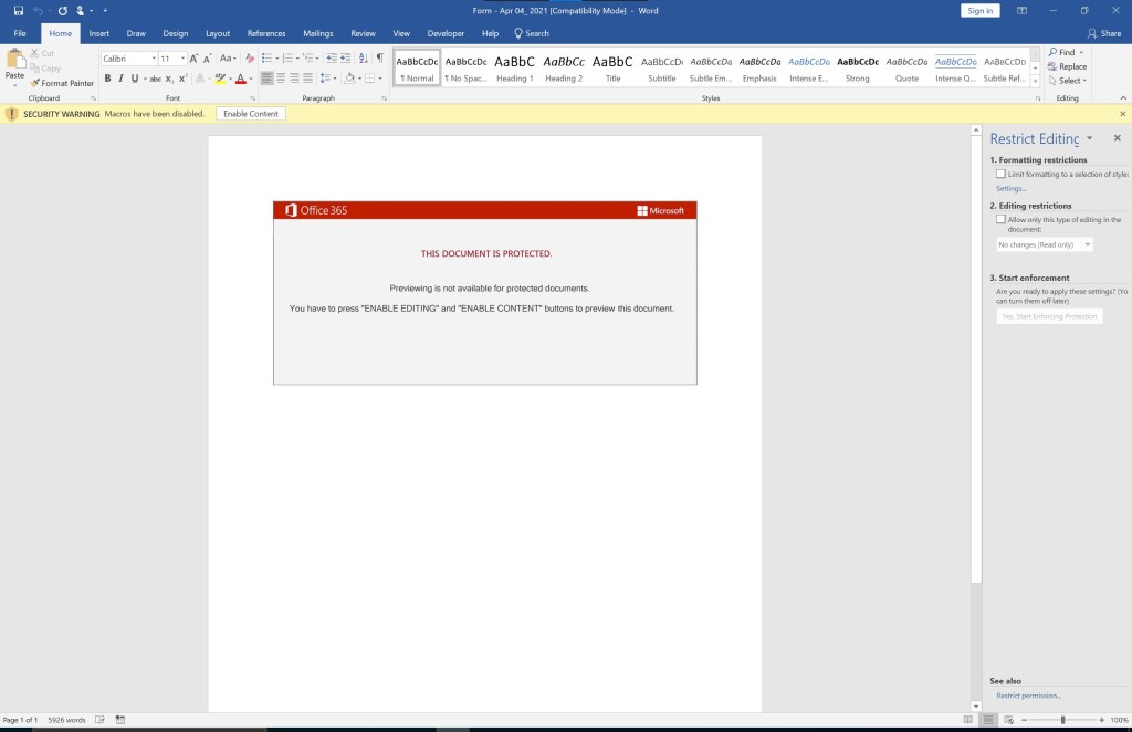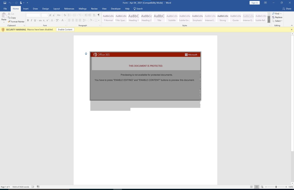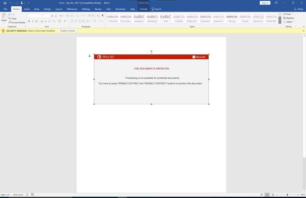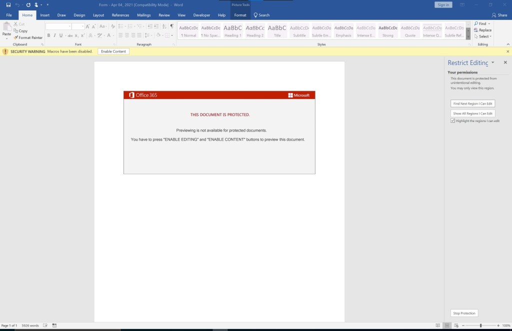 Multiple things should catch your attention. Obviously, the “Enable Content” message and the image forcing people to click the “Enable Content” button. There are also 5926 words, and I do not see any words showing in the Word document itself. Lets “select all” using CTRL+A to see if there is any hidden content: