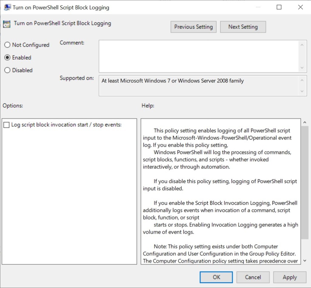 Using a local policy, we can allow auditing to capture the base64 string used in this malware: