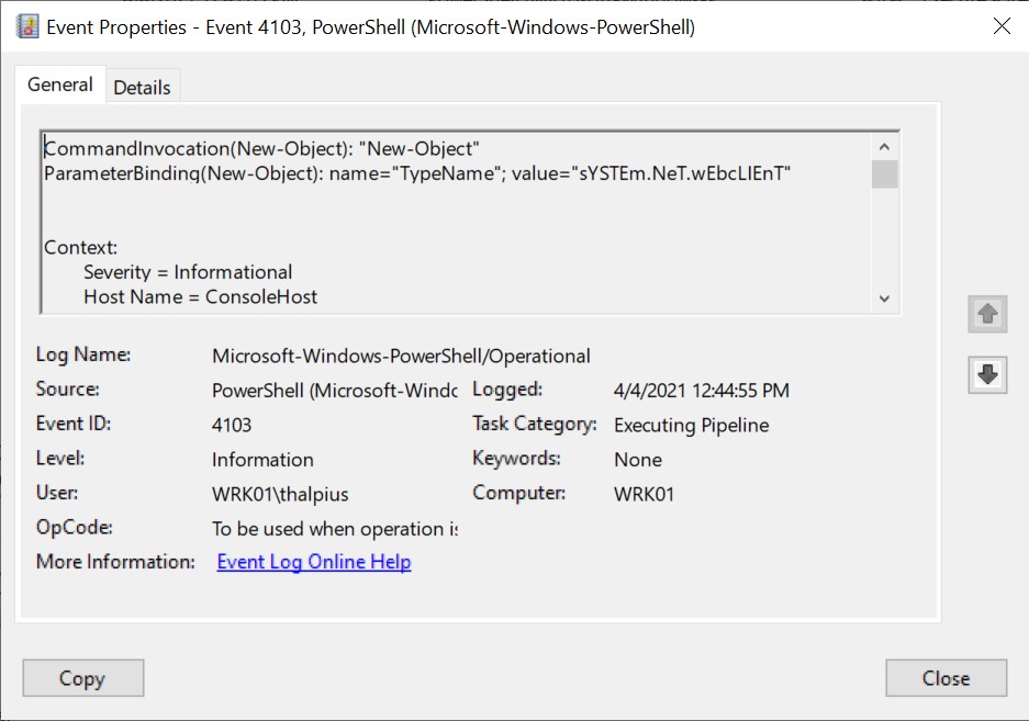 Looking in the event viewer shows us a remarkable command (sYSTEm.NeT.wEbcLIEnT) with upper and lower-case characters (often used in malware to bypass signature-based scanning):
