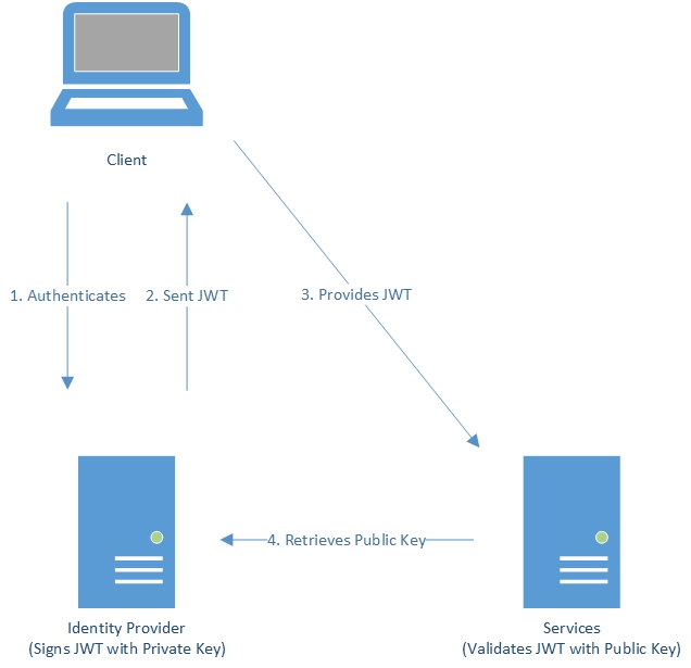 The client authenticates to an Identity Provider, and the Identity Provider creates and signs, using a private key, a JSON Web Token. When the client connects to a service, it provides the signed JSON Web Token. The service validates the token using the public key of the Identity Provider and authenticates the client.