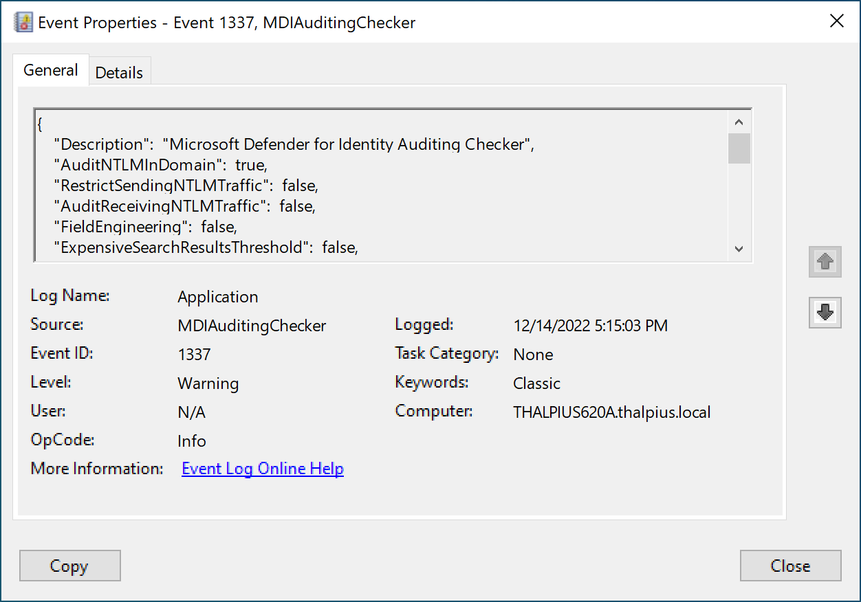 As of the time of writing, the PowerShell script collects all auditing configurations needed for Microsoft Defender for Identity to detect all attacks. I wanted to use as many standard solutions as possible, so I wrote the data to the application log in the event viewer. This way, filtering and ingesting the data to any SOAR solution is easy.