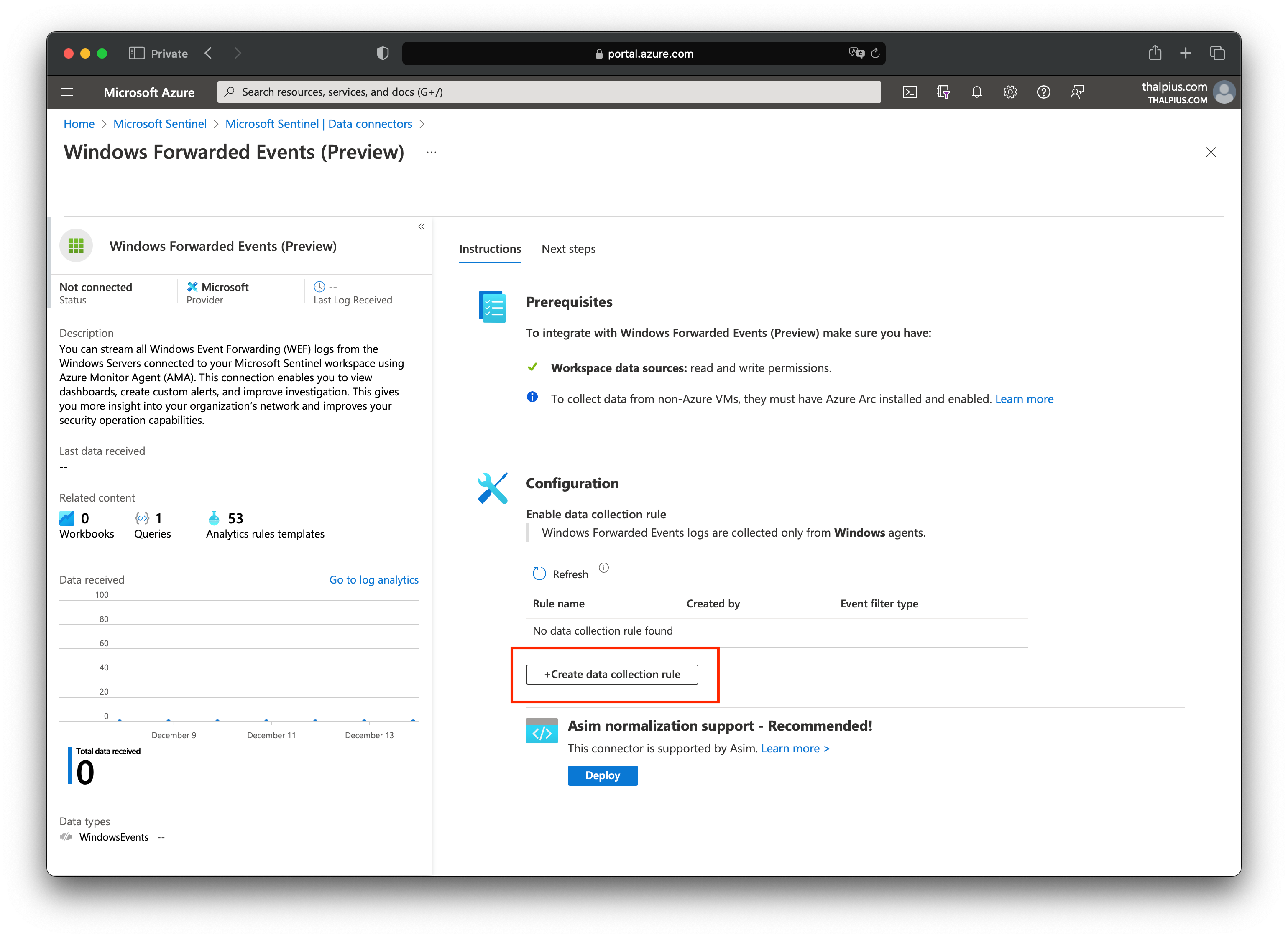 If we look at the data connectors in Microsoft Sentinel, we see a connector named “Windows Forwarded Events.” Once we open the connector page, we can add a Data Collection Rule: