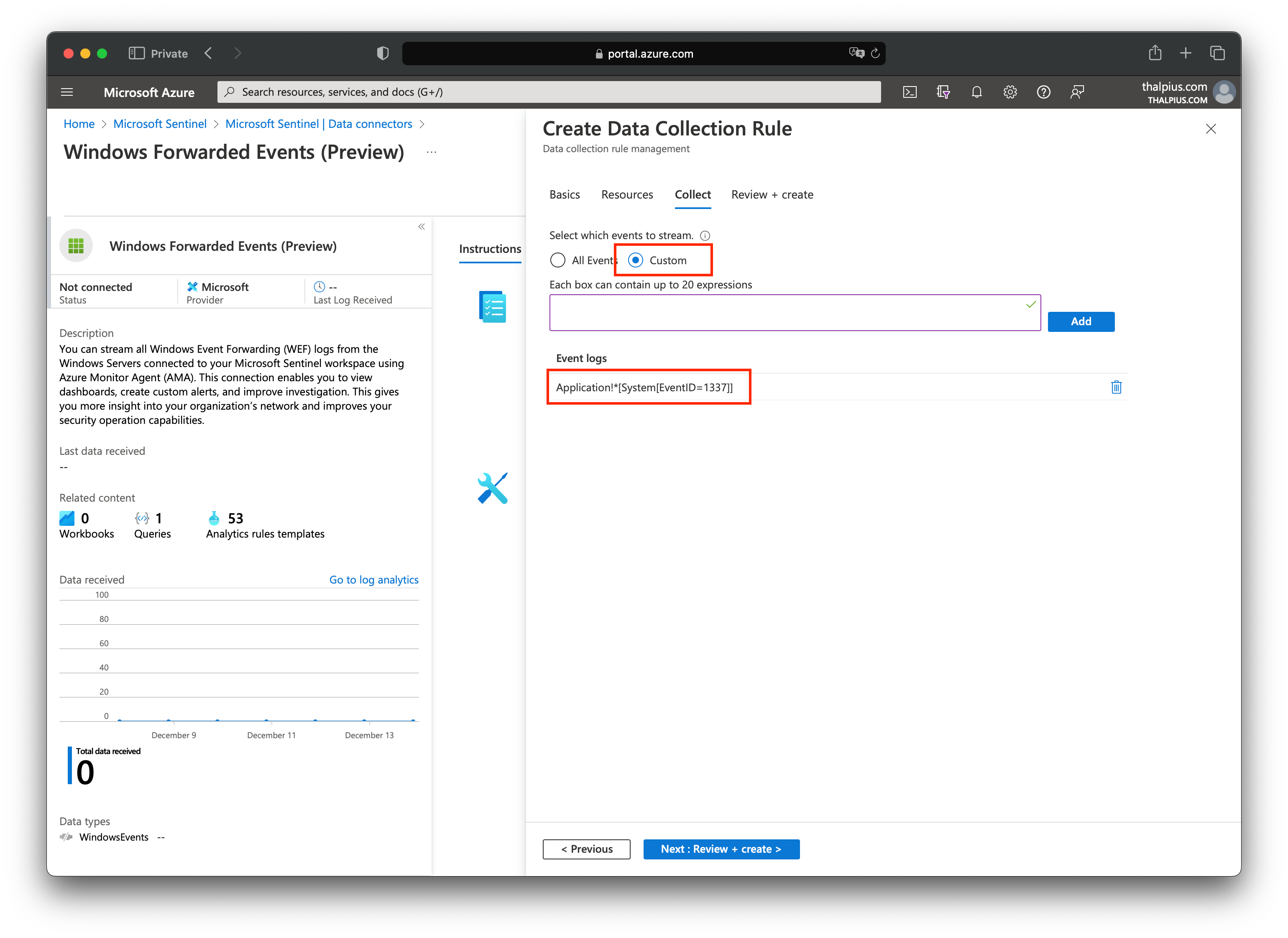 Now that we have the data in the event viewer, we want the data to ingest into Microsoft Sentinel. Since the Azure Monitor Agent supports custom events, we can “filter” for only certain events sent to the cloud using Azure Collection Rules.