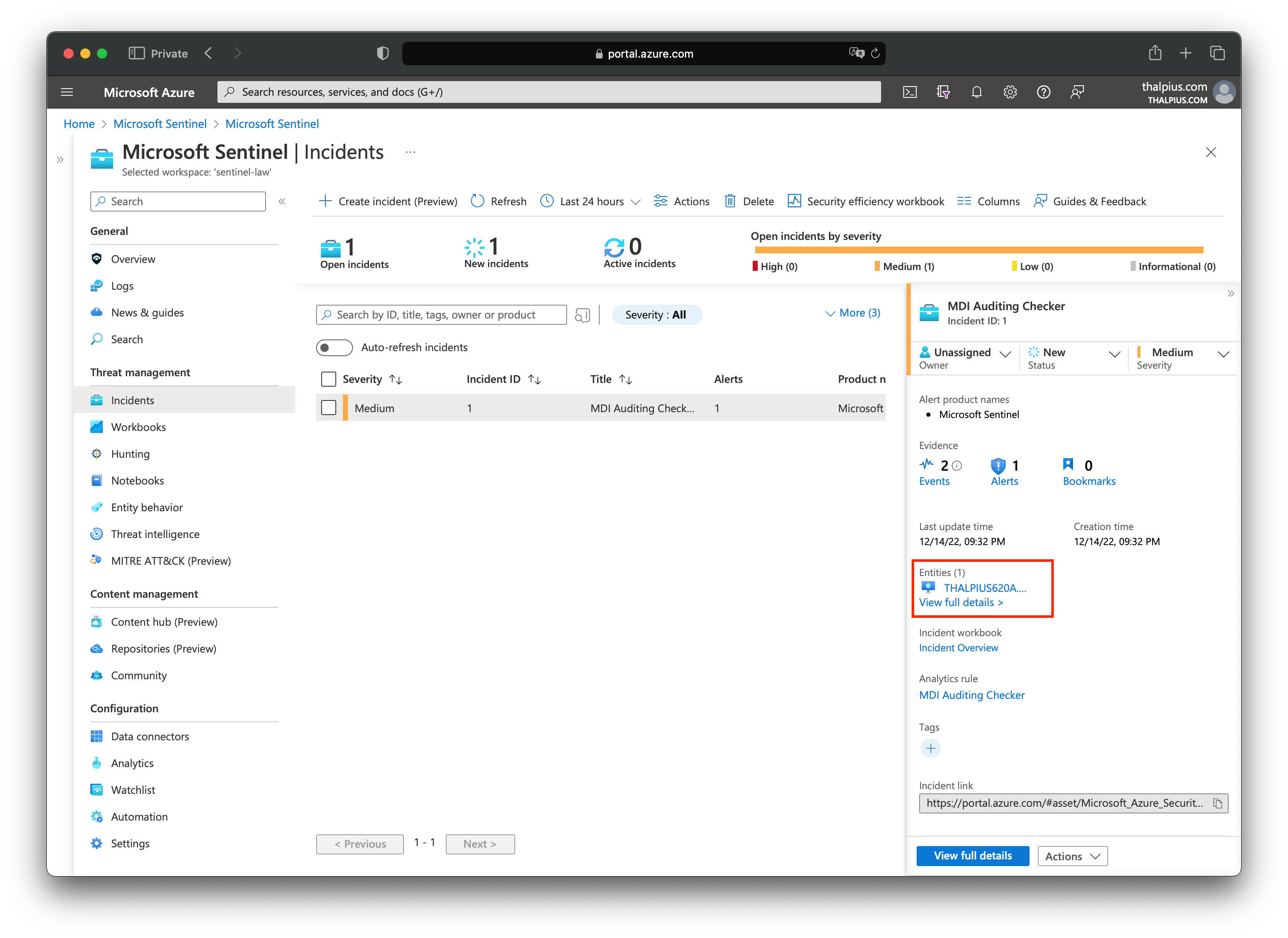 The result is an alert in Microsoft Sentinel if Microsoft Defender for Identity is not configured correctly, including the hostname: