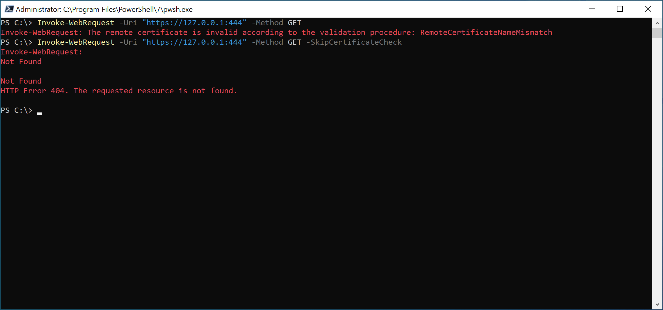 The first thing I did was send a simple GET request to see if I could get a response. I got a certificate error at first, but by skipping the certificate check, I got the error 404.