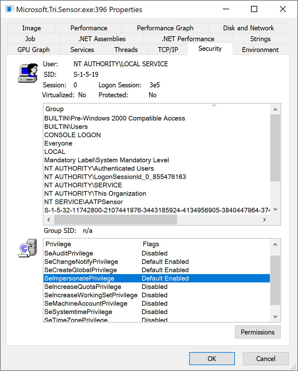 The permission which I find interesting is the SeImpersonatePrivilege permission. Because SeImpersonatePrivilege allows code to impersonate a different Windows user, it is a known way for an attacker to escalate their privileges. There are options to limit the permissions for the Local Service account, but that is not the case for the AATPSensor service.