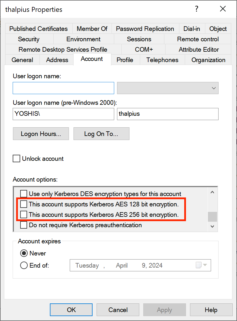 Important: Suppose you enable “This account supports Kerberos AES 256-bit encryption” on an identity. In that case, it only means the identity SUPPORTS AES encryption, but it still allows an attacker to request an RC4 encrypted ticket, which they can brute-force and get a plain-text password.