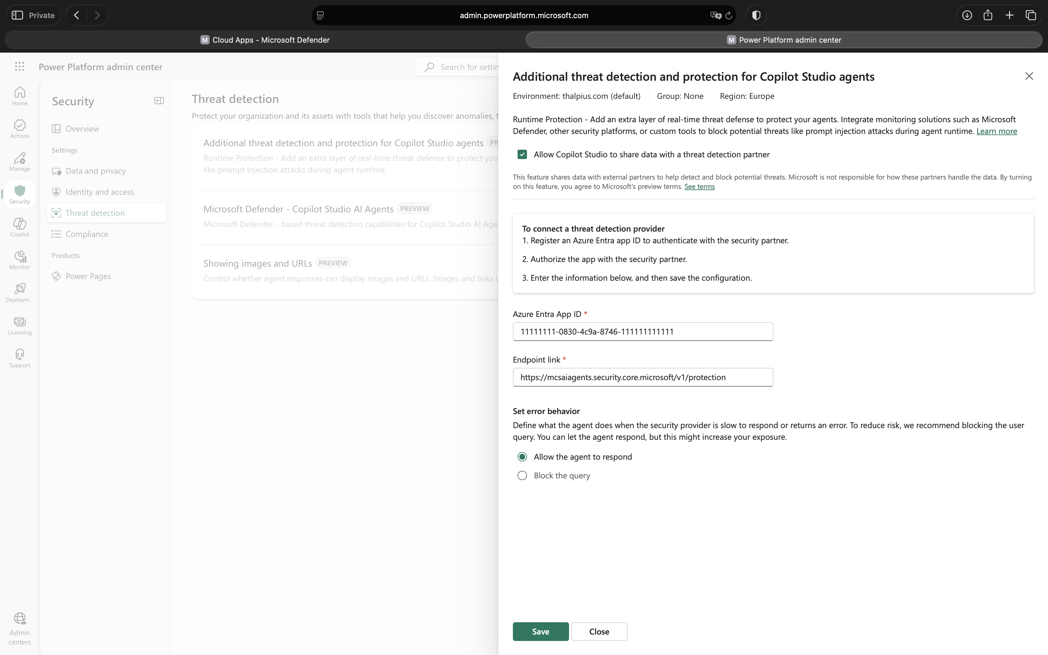 The Microsoft Power Platform administrator now needs to configure Microsoft Copilot Studio to route security decisions through Microsoft Defender. This configuration connects the Entra ID application you created to the Power Platform environment.
