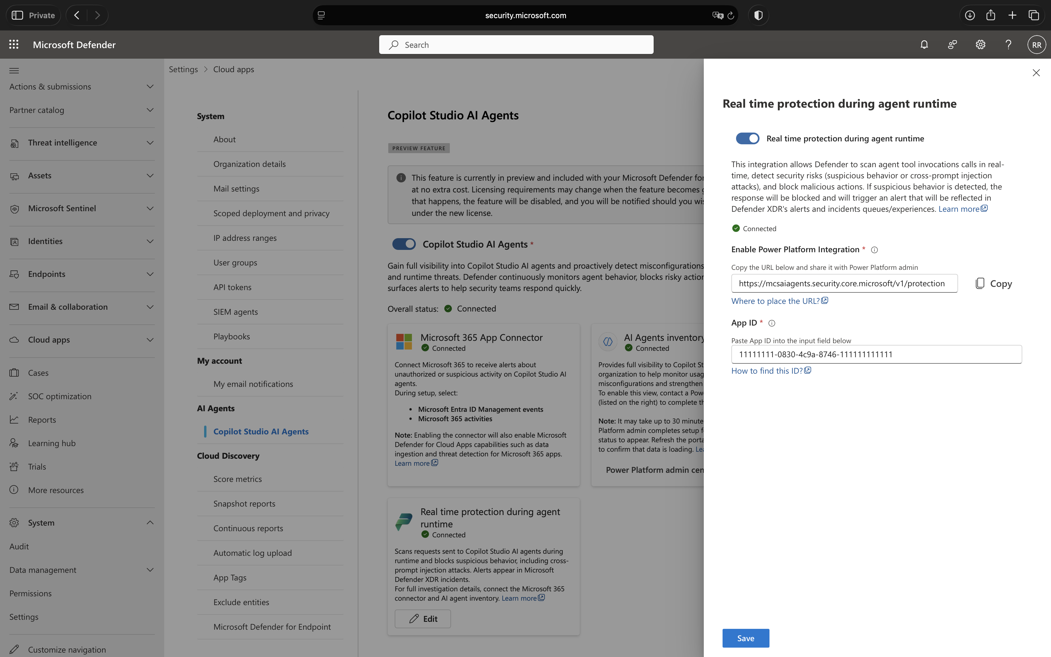 - Return to the Microsoft Defender portal and navigate to System > Settings > Cloud Apps > Copilot Studio AI Agents.