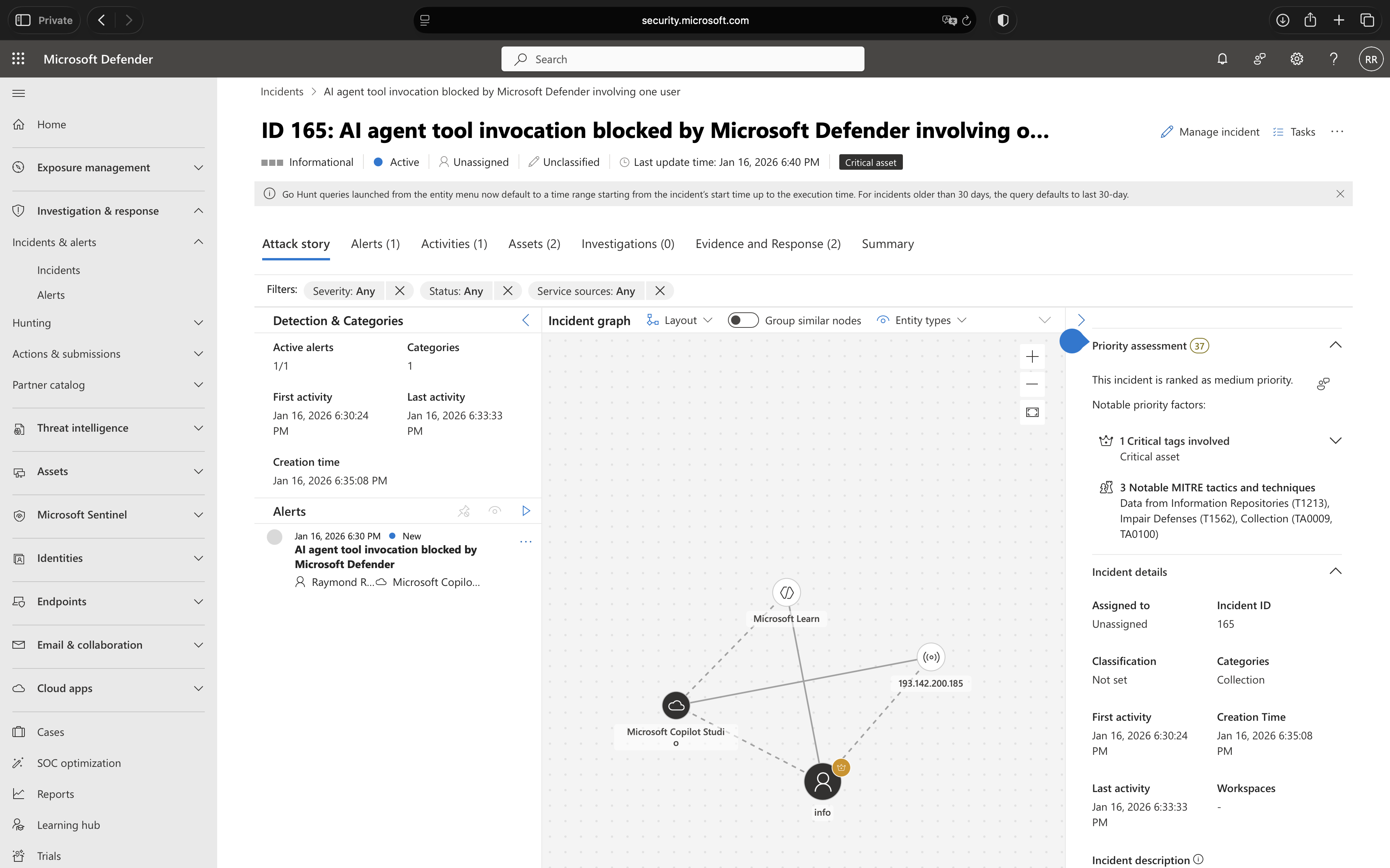 Security analysts can investigate these alerts directly within the Microsoft Defender portal to determine whether the blocked action was a legitimate threat or a false positive. The alert contains sufficient context to understand the user’s intent, the agent’s proposed action, and why it was flagged as suspicious. Based on this investigation, analysts can take appropriate action – whether that’s confirming the threat was correctly blocked, adjusting agent configurations to prevent similar false positives, or investigating potential security incidents further.