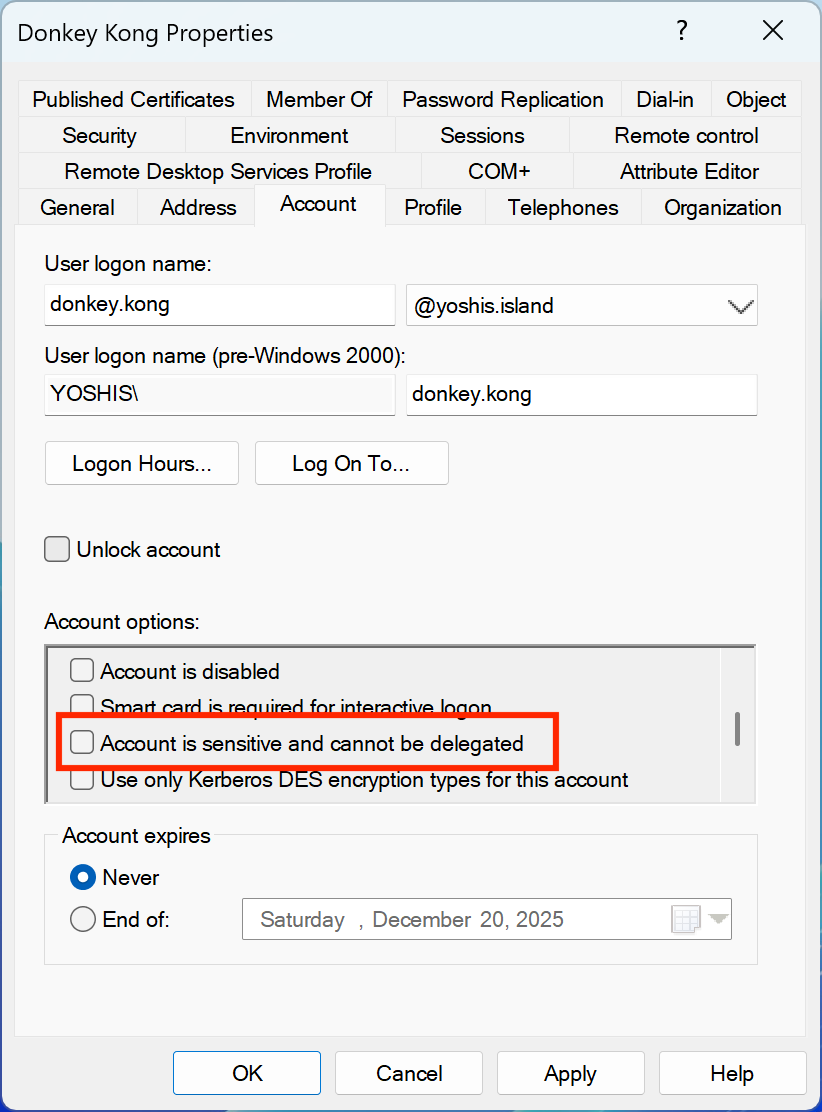 Kerberos delegation, while designed as a legitimate feature for multi-tier application architectures, becomes a dangerous credential theft vector when privileged accounts are left unprotected. The “Account is sensitive and cannot be delegated” setting represents a critical security control that prevents your most powerful administrative credentials from being forwarded to services where they could be captured and exploited by attackers. This single configuration change effectively eliminates an entire class of privilege escalation attacks without impacting the normal administrative functions of these accounts.